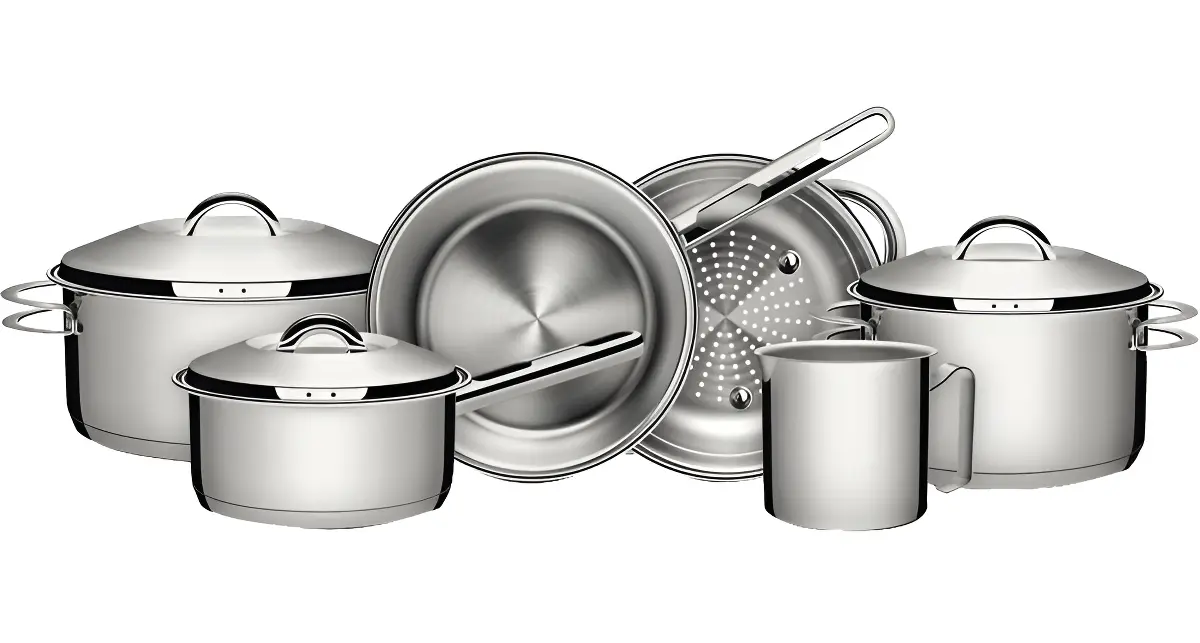 Conjunto de Panelas de Aço Inox Solar com fundo triplo (aço inox + alumínio + aço inox) que distribui o calor uniformemente, proporcionando um cozimento mais rápido e economia de energia, mantendo os alimentos macios, saborosos e aquecidos por mais tempo.